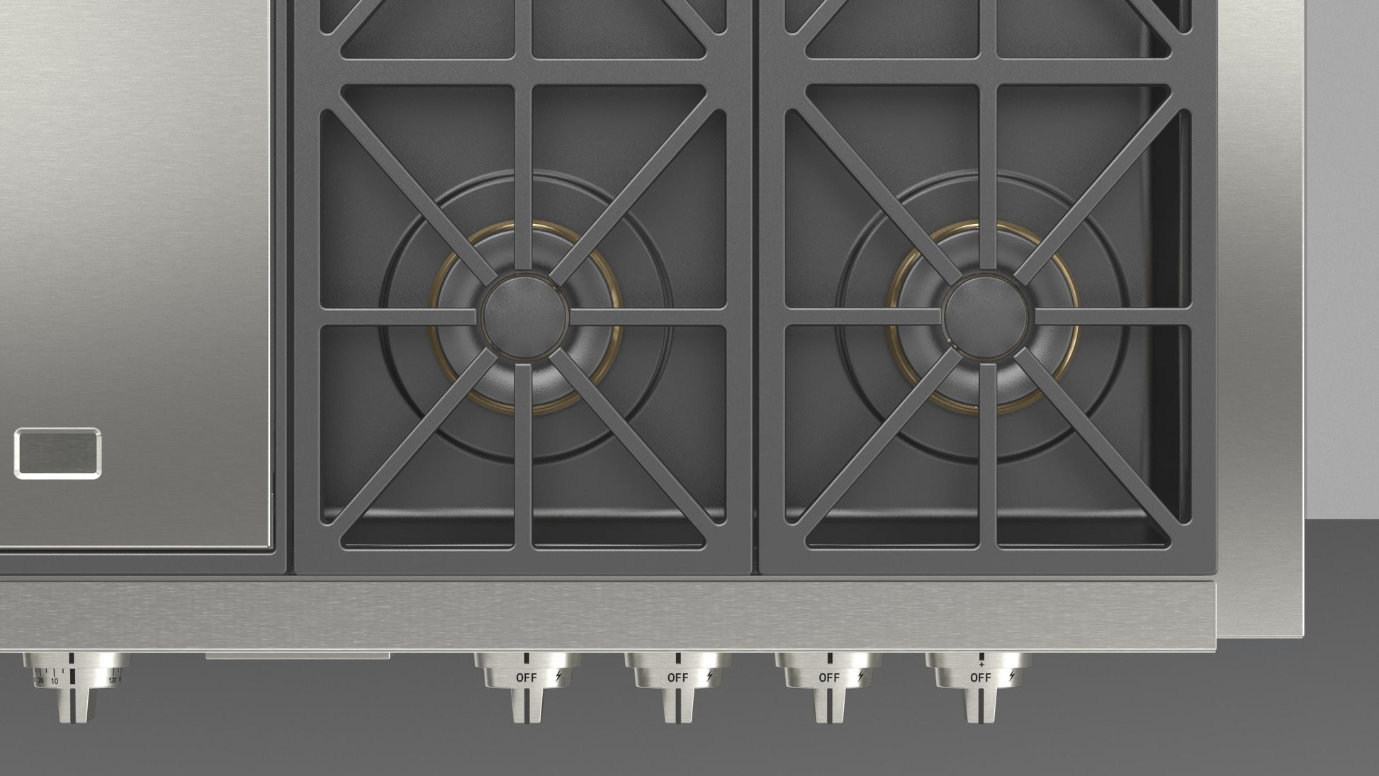 A combination of burner rings at different levels controls the relation of the flame to the bottom of the cooking vessel, allowing whisper-soft heat for melting or rendering to ultra-high sea-ring and deglazing.